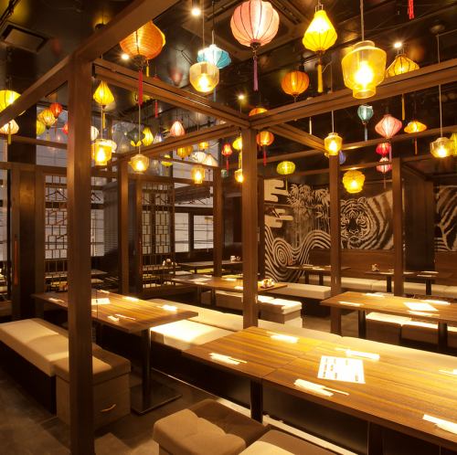 【最大70名様OKの半個室も完備】2階はちょっと非日常なおしゃれな壁紙も絵になる空間です♪40名以上で貸し切りにも!